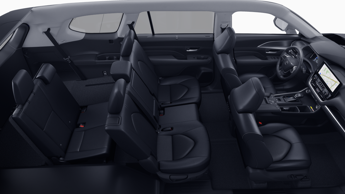 • 7-passenger seating with second-row fold-down captain's chairs and fold-down inboard armrests, adjustable headrests and two cup holders mounted on the floor; and 60/40 split, fold-down third-row seats with sliding headrests and recline function